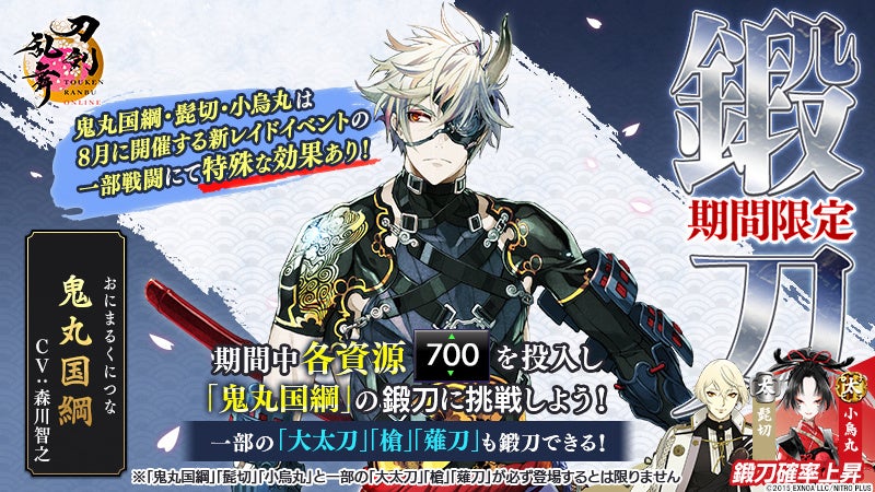 2024年7月30日(火)メンテナンス後より、刀剣男士「鬼丸国綱(cv.森川智之)」が期間限定で各資源「700」の鍛刀に登場します。