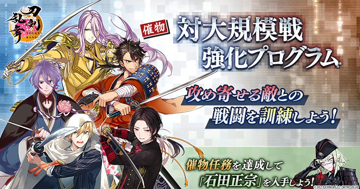 合同会社EXNOA( 本社:東京都港区、CEO:村中 悠介、URL:https://games.dmm.com/ )は、同社が開発・運営、株式会社ニトロプラスが世界観・シナリオ・キャラクターデザインを担当している、刀剣育成シミュレーション『刀剣乱舞ONLINE』にて、2024年7月30日(火)メンテナンス後より新イベント「対大規模戦強化プログラム」を開催していることをお知らせいたします。