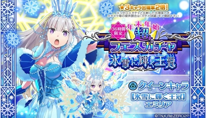 また、「【氷雪に輝く王冠】エミリア★3」が再登場する「36時間限定年末年始超フェスガチャ【氷雪に輝く王冠】」も開催中です。