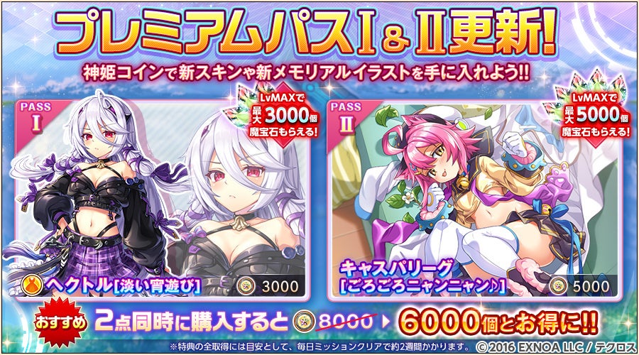 合同会社EXNOA(本社:東京都港区、CEO:村中 悠介、URL:https://games.dmm.com/)が運営するDMM GAMESにおいて『神姫PROJECT』は、「フリッグ」「バルドル」が新衣装で登場する事を発表した。さらに7月29日よりプレミアムパスの特典が更新された。