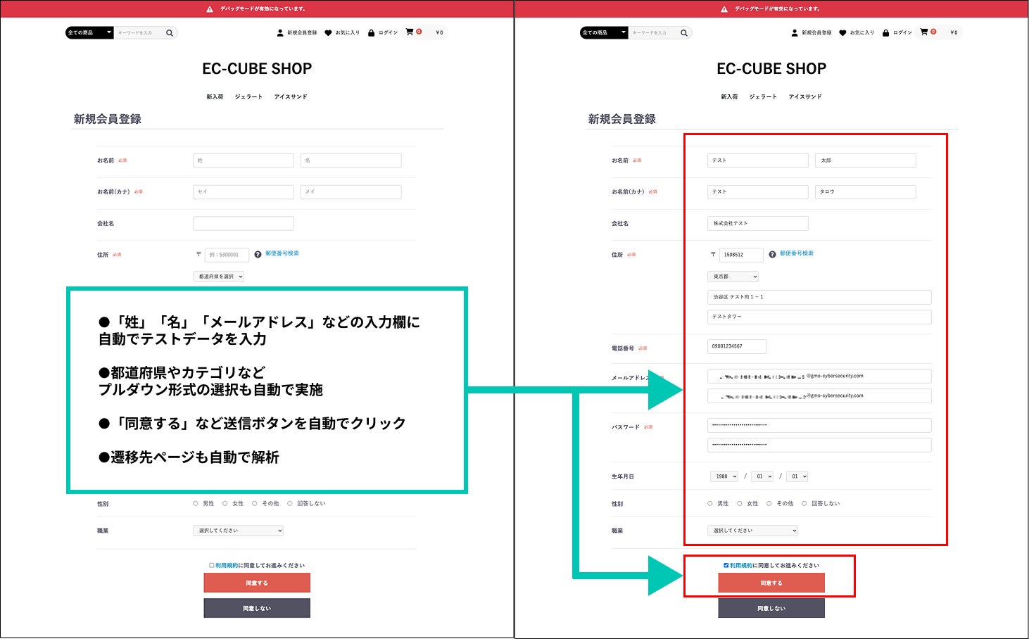 たとえば、これまでは自動対応が難しかったログイン後の会員専用ページやECサイトの購入画面といった、ユーザーの入力が必要なページに対しても、AIエージェントが自動的に情報を入力・送信することで脆弱性診断が可能となりました。また、カート操作や問い合わせフォームの利用など、実際のユーザー行動をAIエージェントが再現することで、多種多様なフォーム脆弱性の検出にも対応します。