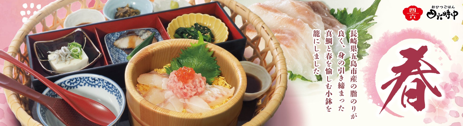 当社は食を通じて季節を感じていただける、こだわりの旬素材を取り入れた季節限定メニューを展開しています。この度、『おひつごはん四六時中』では、春爛漫をイメージし、長崎県五島市産の真鯛をメインに仕立てたおひつごはんと春の旬素材(しらす・菜の花・鰆)を使用した3種の小鉢を盛り込んだ「春爛漫花籠」を季節限定でご提供いたします。「おひつごはん」は、錦糸たまごを敷き詰め、ほんのり桜色した「真鯛」をはじめ「まぐろたたき」や「いくら」で春らしい彩り豊かなトッピングをし、付け合わせには「瀬戸内産しらすのせ豆腐」、「菜の花のお浸し」、「鰆の黒酢かけ」と春を感じる小鉢を取り揃えました。この春のさまざまなお祝いや団欒の場で、春の味覚満載の季節限定メニューをお愉しみいただければと考えております。