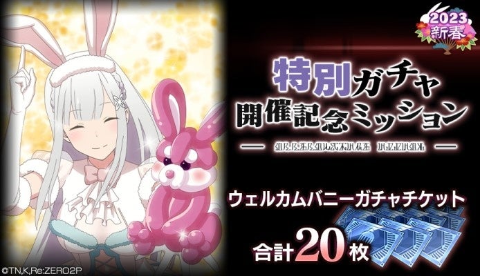 内容:新たな特別ガチャキャラ「【ウェルカムバニー】エミリア★3」の登場を記念して、「ウェルカムバニーガチャチケット」合計20枚が手に入るミッションを開催します。