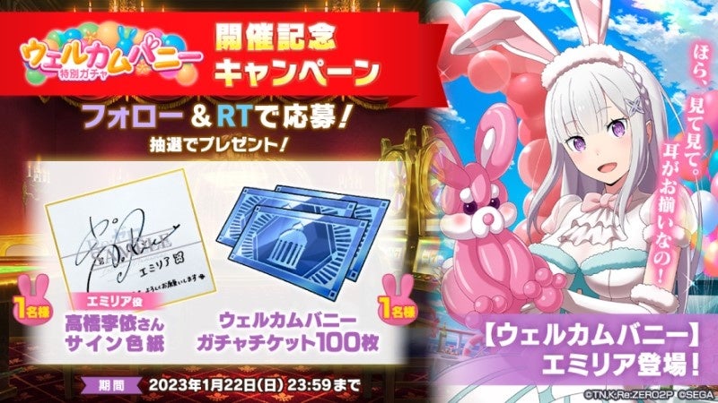 内容:『リゼロス』公式Twitter ( https://twitter.com/re_zero_rezelos )をフォロー&キャンペーンツイートをRTすると、抽選で「エミリア役 高橋李依さんサイン色紙」を1名様に、「ウェルカムバニーガチャチケット100枚」を1名様にプレゼントするキャンペーンを開催します。