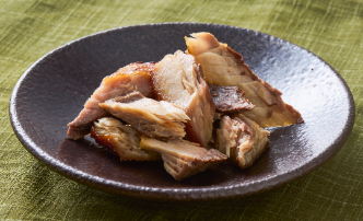 原料の骨取り処理をしたあとで調味液に漬け込み、乾燥させることでうまみを凝縮させた状態で焼き上げています。焼き上げの際は、あえて皮をつけたまま行うことで、脂が焼ける香ばしさが身に残り、風味を高めています。焼いた後は、手作業で皮を外しながら身をほぐしています。