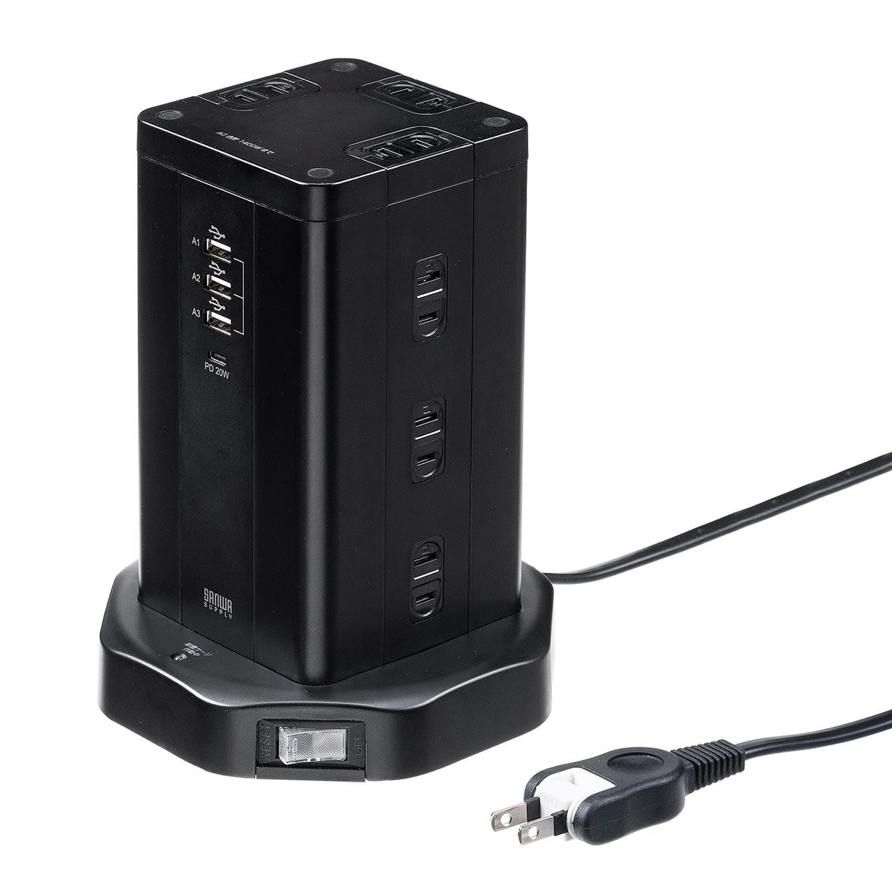 ■タワー型電源タップ 12個口・3m USB-A×3ポート USB-C ×1ポート PD/20W対応 700-TAP074