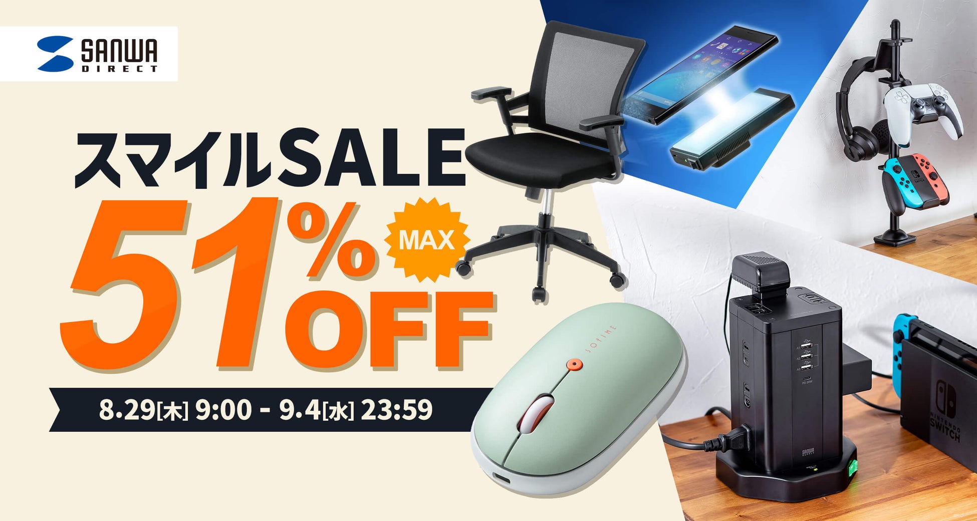 サンワサプライ株式会社(本社:岡山市北区田町1-10-1、 代表取締役社長 山田 和範)が運営するサンワダイレクト Amazon店は、Amazon.co.jpにて1716製品が最大51%OFFになるタイムセールを08月29日(木)から09月04日(水)までの7日間開催いたします。