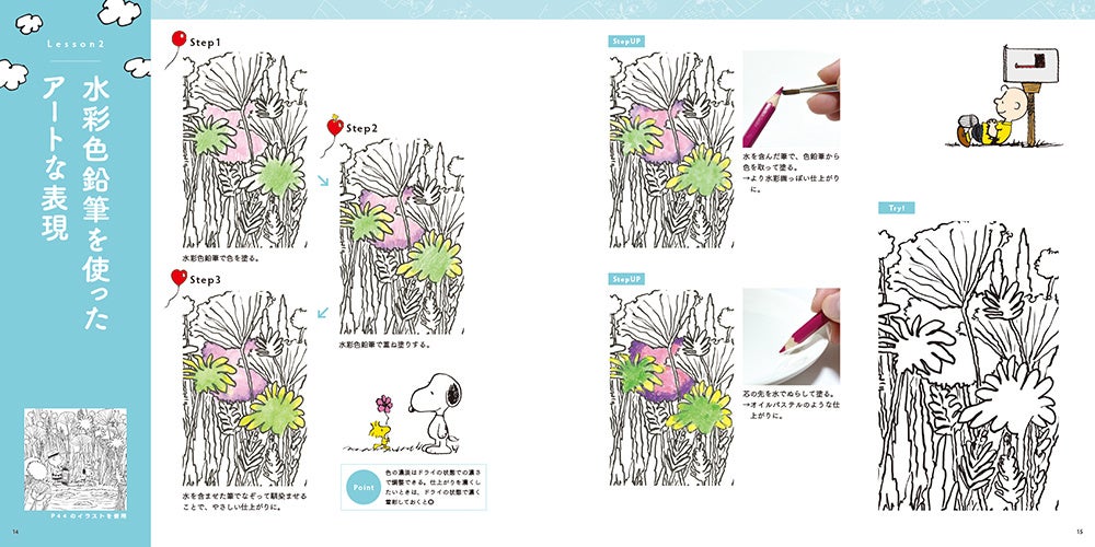 さまざまな画材と塗り方で楽しめるピーナッツの塗り絵レッスンブックが新登場!