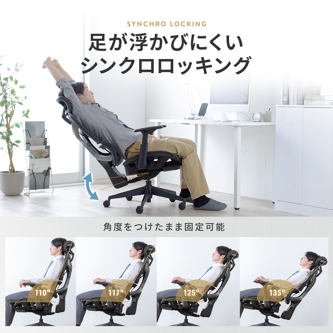 メッシュチェア オフィスチェア エルゴノミクスチェア 高耐荷重125kg シンクロロッキング ハイバック スライド式オットマン アームレスト 座面スライド 上下可動ヘッドレスト ランバーサポート