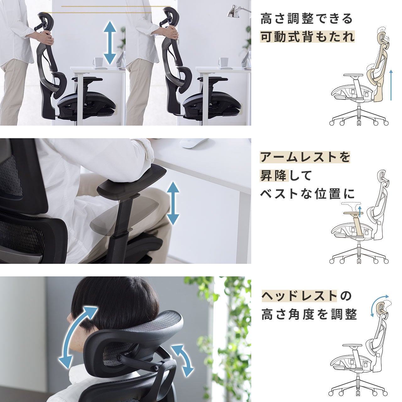 上下可動肘を採用し、上下方向の高さ調整が可能です。取り外しも可能です。上下方向と、二つの可動部分によりに好みの位置に調節可能なヘッドレスト付きです。