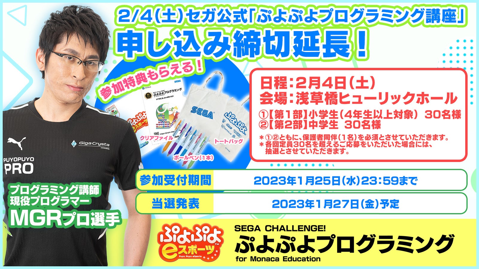 株式会社セガは、セガ公式のイベントとして「ぷよぷよプログラミング講座」を2023年2月4日(土)に、浅草橋ヒューリックホールにて開催いたします。参加申し込みは受け付け中で、1月25日(水)23:59まで延長することといたしました。