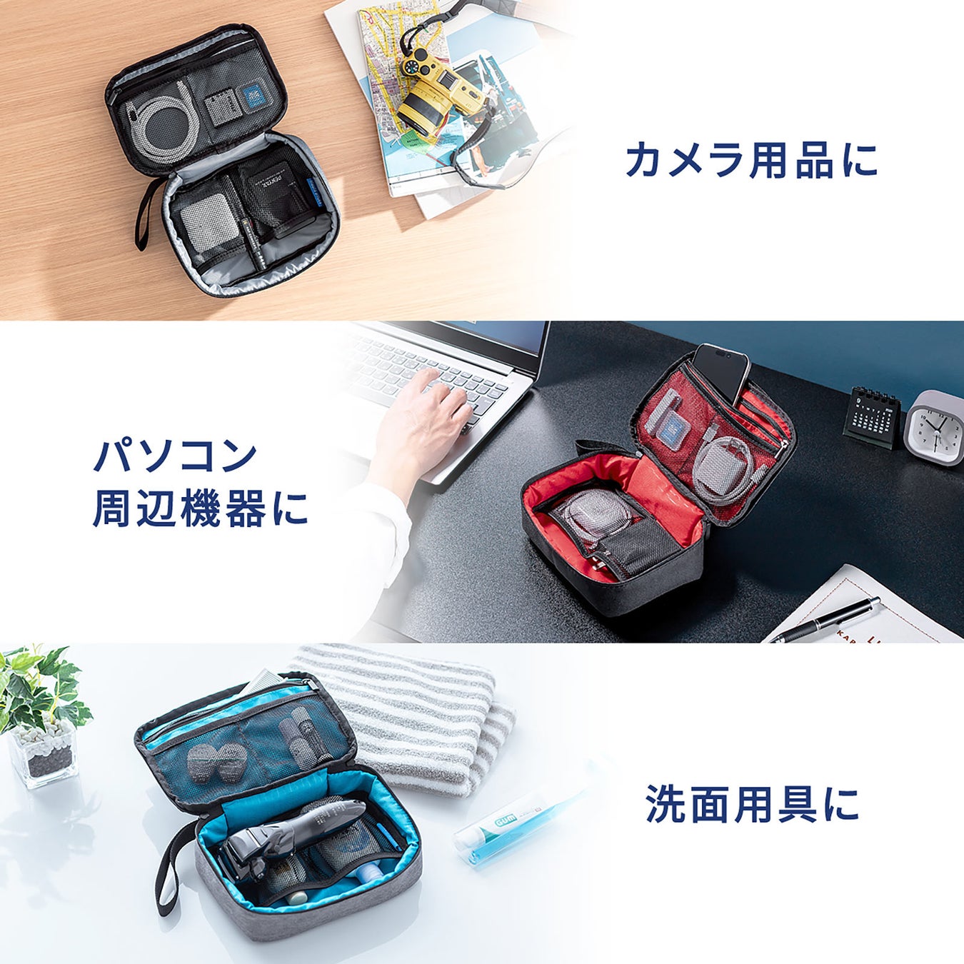 パソコン周辺機器やその他の小物も収納できるため、日常使いにもぴったりです。家やオフィスでも使いやすく、コンパクトながらも収納力抜群なため、様々なシーンで活躍する万能ポーチです。