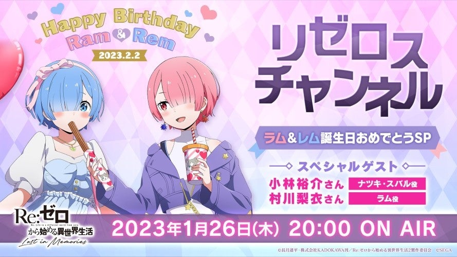 株式会社セガは、人気テレビアニメ「Re:ゼロから始める異世界生活」公式スマートフォン向けゲーム『Re:ゼロから始める異世界生活 Lost in Memories(以下、『リゼロス』)』にて、2023年1月26日(木)20:00より、『リゼロス』公式放送「リゼロスチャンネル」ラム&レム誕生日おめでとうSPの配信が決定したことをお知らせします。