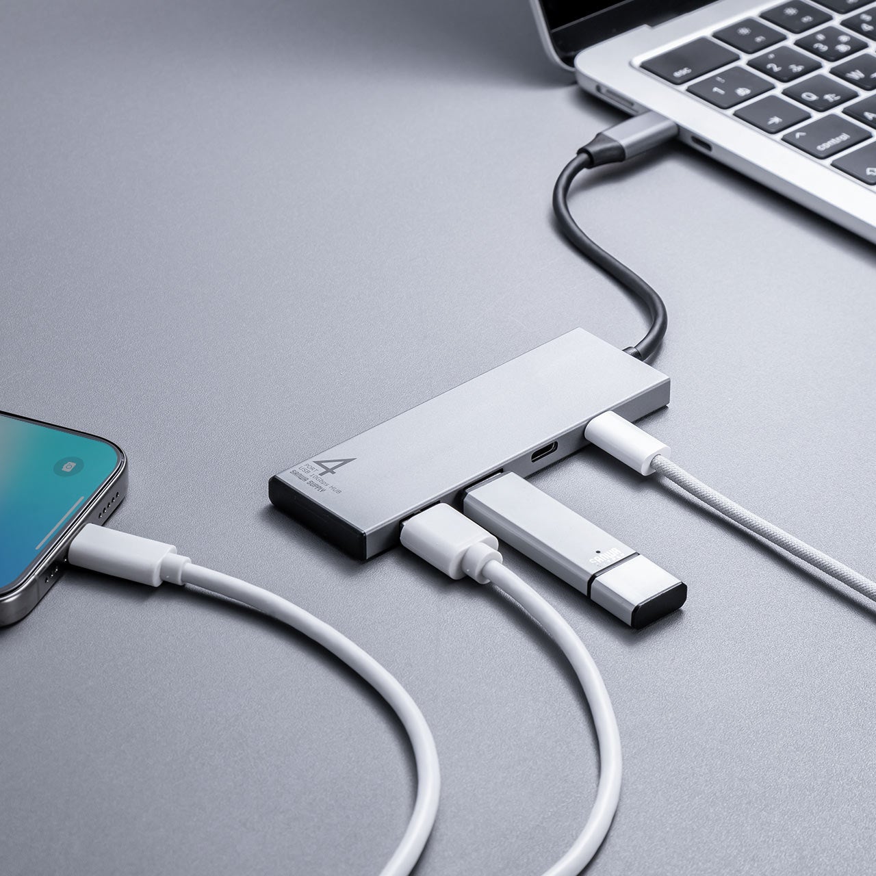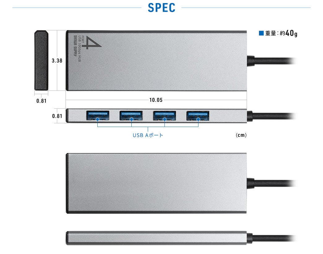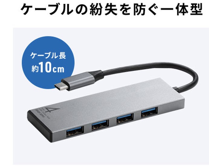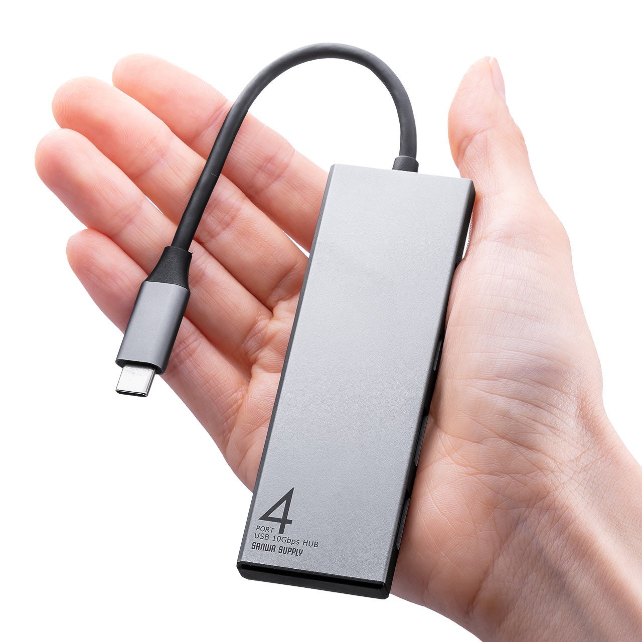 ・【薄型 軽量】USB TypeC 4ポートハブ 【A×4】ケーブル一体型 USB3.2 Gen2対応 10Gbps高速対応 アルミ放熱 Windows Mac iPad Chromebook 対応 400-HUBC28GM