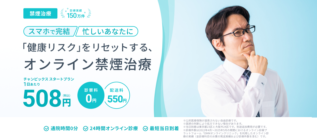 合同会社DMM.com(本社:東京都港区、イノベーションカンパニーCEO:緒方悠、以下DMM)と医療法人社団DMH(理事長:島佑介)の連携事業であるオンライン診療プラットフォーム「DMMオンラインクリニック」は、2025年12月18日より禁煙に関する診療及び医療用医薬品の処方、受け渡しを開始いたします。
