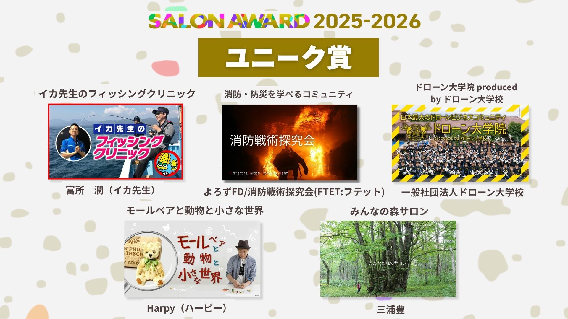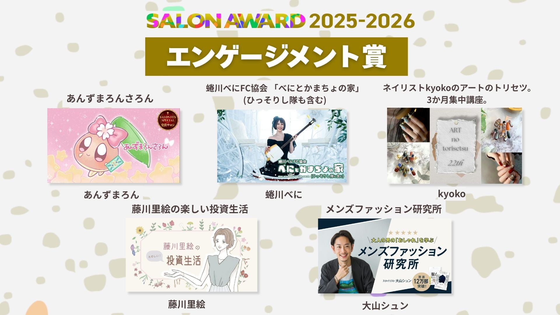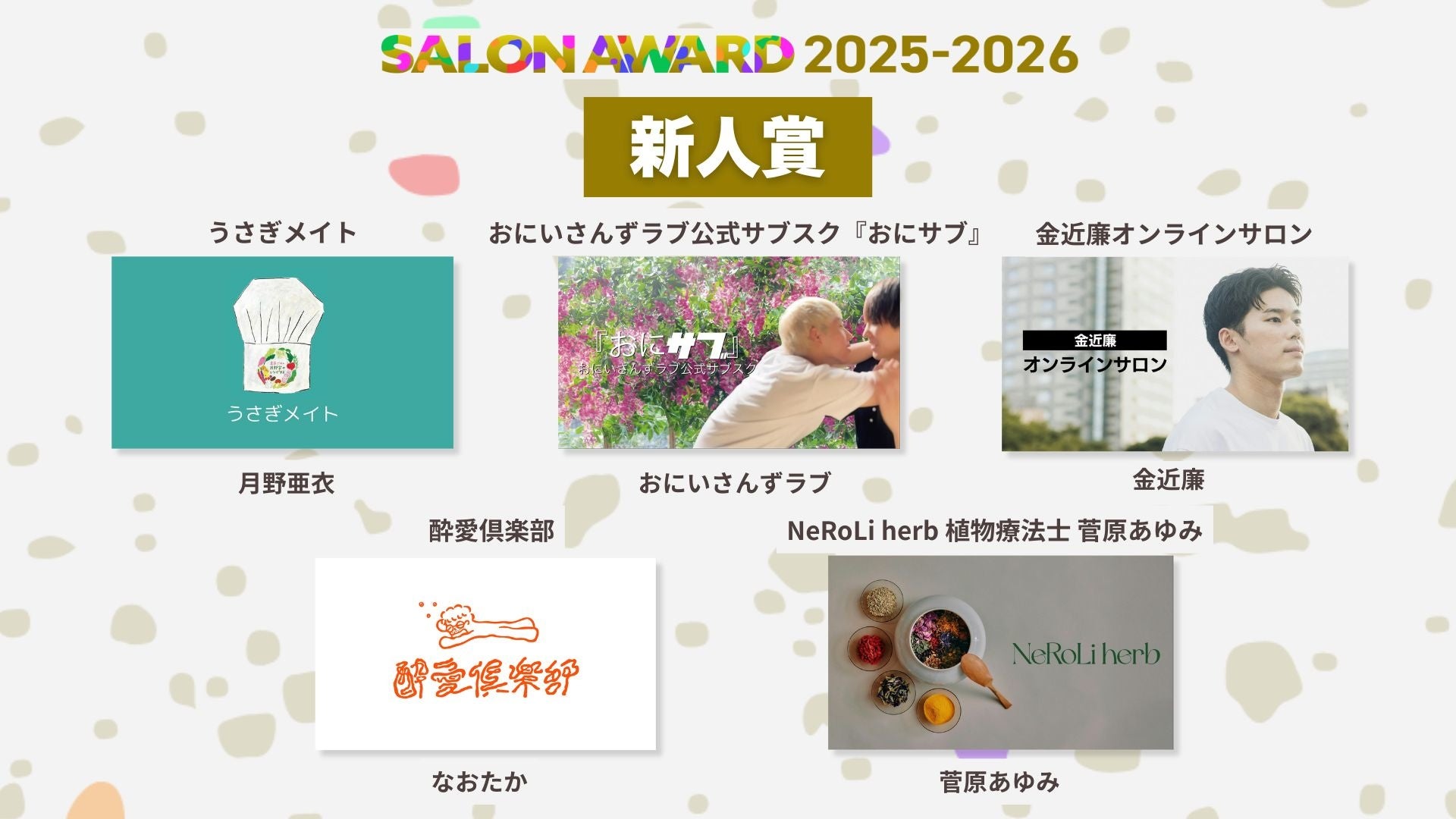 ノミネートされた25組の中から、会員数やコンテンツの充実度、コミュニティの熱量などを総合的に審査し、各賞の受賞サロンを選出いたします。 結果発表および表彰は、2026年1月17日(土)に開催される「SALON AWARD 2025-2026」の会場にて行います。