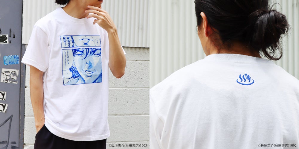 背面には、ぷっくりと立体感のある発泡プリントで温泉モチーフのロゴを配置。洗濯をしてもよれにくい6.2オンスのタフな生地を使用しています。