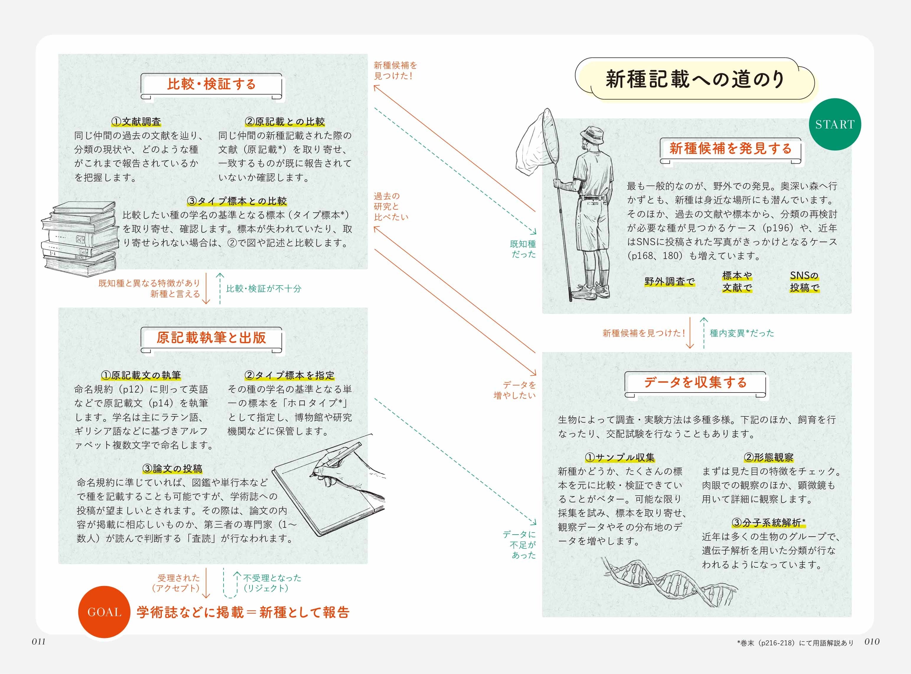 巻頭では、新種の発見から記載までのフローチャートや、記載論文の内容解説など、新種記載にまつわる基礎知識を解説しました。またエピソードに登場する専門用語は、巻末に用語集を設け、専門家の監修のもとで解説しました。中学、高校での生物の授業では触れられない、生物観察を行なう上で知っておきたい、分類学の基礎知識を身につけることができる一冊となっています。