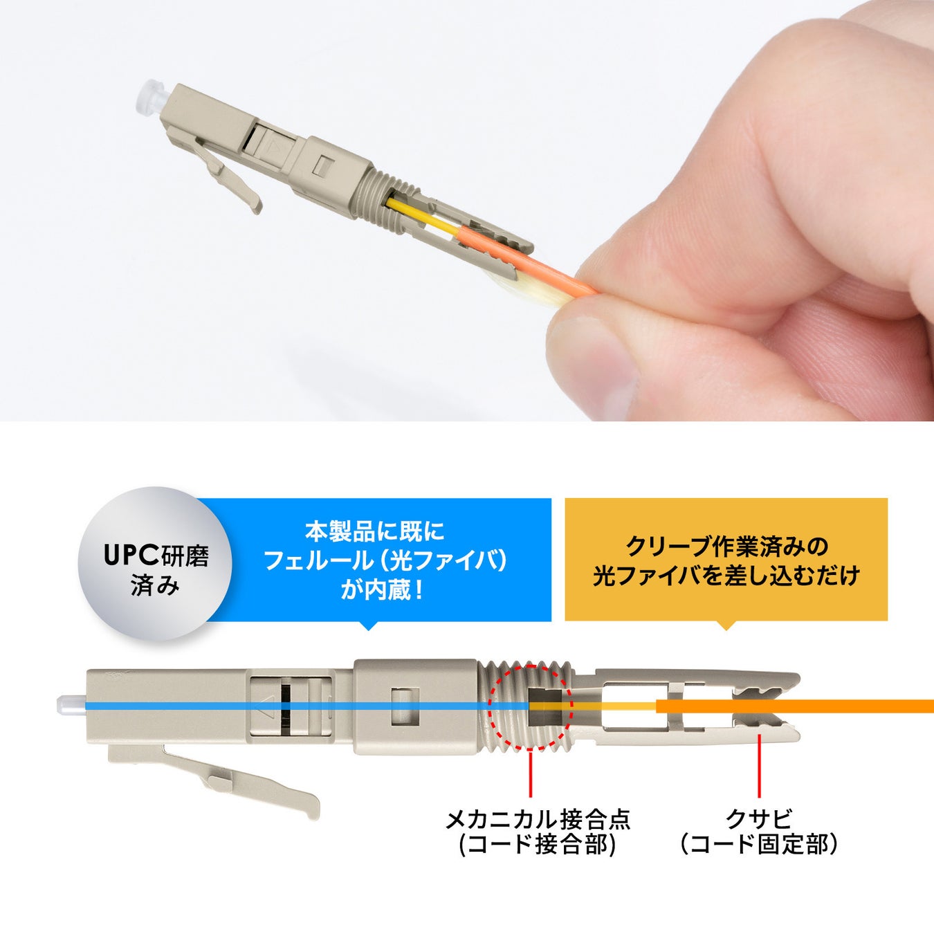 先端部分は、UPC研磨済みのメカニカルスプライス構造を内蔵しているので、面倒な研磨作業や接着作業が不要です。光ファイバコードを本製品に差し込むだけなので、加工時間を大幅に削減できます。