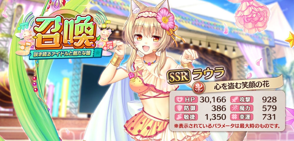 ※SSRラウラ【心を盗む笑顔の花】、SSRアリン【太陽とひと夏の冒険】は咲き誇るアイドルと新たな蕾召喚からも獲得可能です