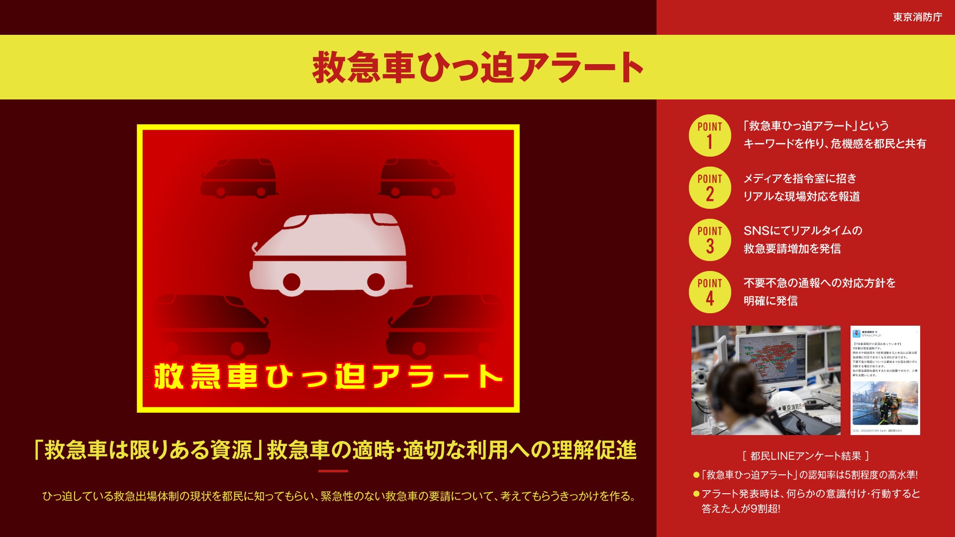 ○「救急車ひっ迫アラート」という言葉を使い、不要不急の電話は途中で切ることを丁寧な広報活動で伝えつつ、都民も自発的に発信してくれる点も期待できる。