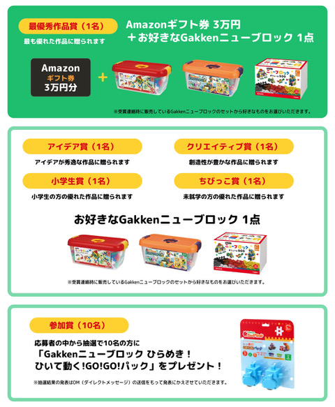 本コンテストでは、応募作品の中から5つの賞「最優秀作品賞」「アイデア賞」「クリエイティブ賞」「小学生賞」「ちびっこ賞」(各1名)を選定、「最優秀作品賞」の方にはAmazonギフト券3万円とお好きなGakkenニューブロックを進呈します。