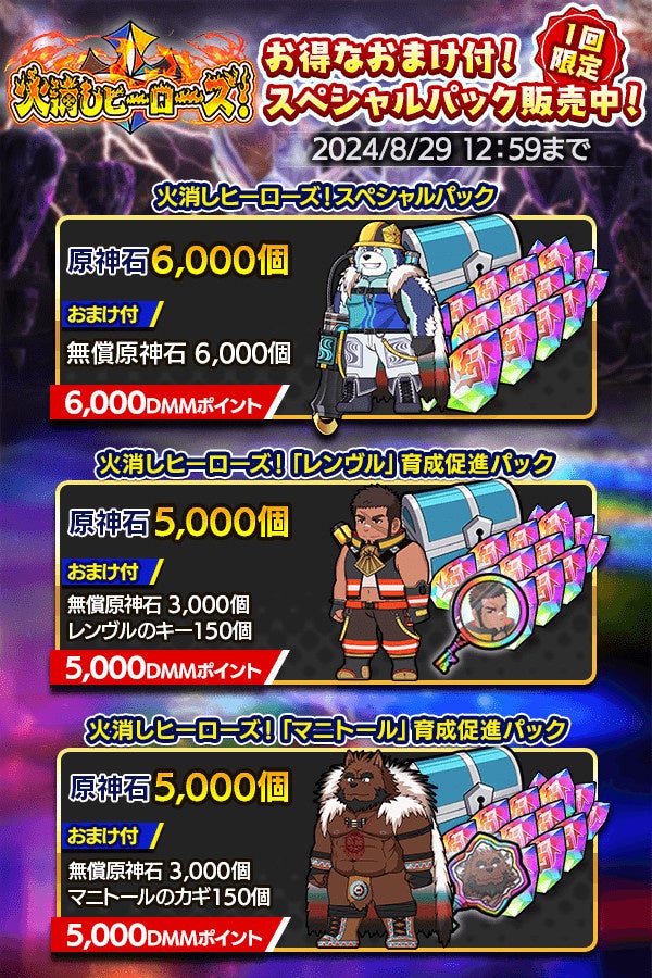 1回購入限定の「火消しヒーローズ!」各種パックが3種登場!期間限定のこの機会をお見逃しなく。