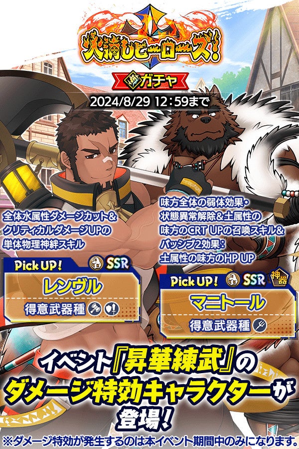 SSR魂友「レンヴル」とSSR神器「マニトール」が入手しやすい「火消しヒーローズ!ガチャ」をお見逃しなく。
