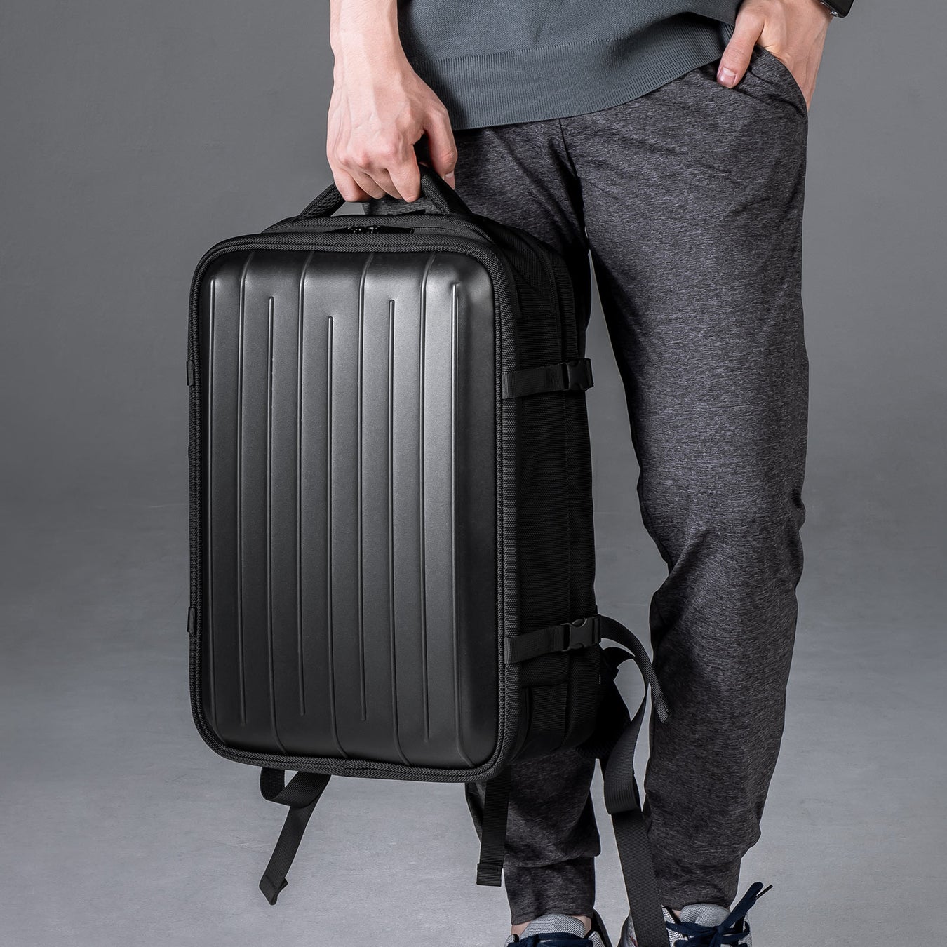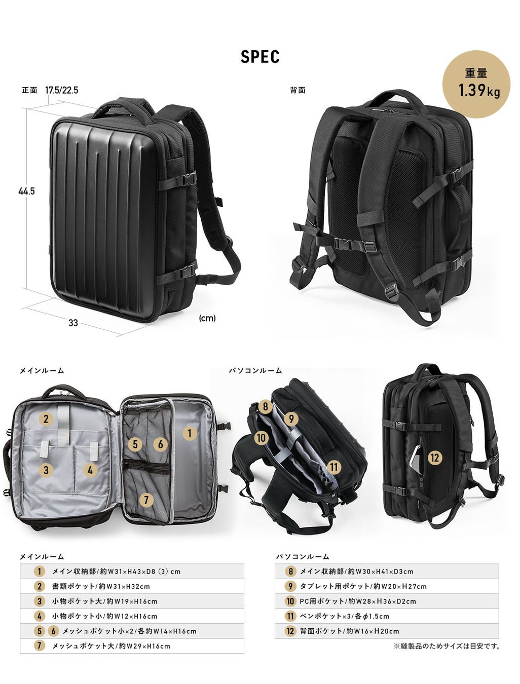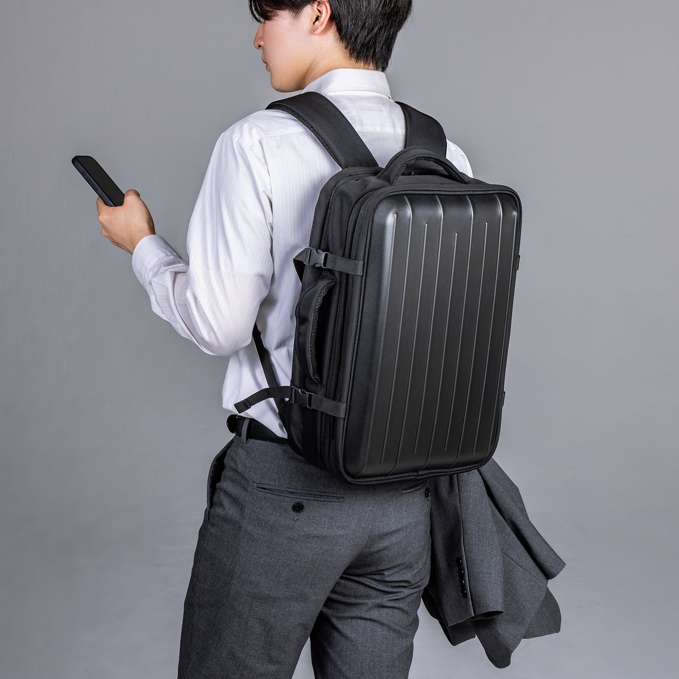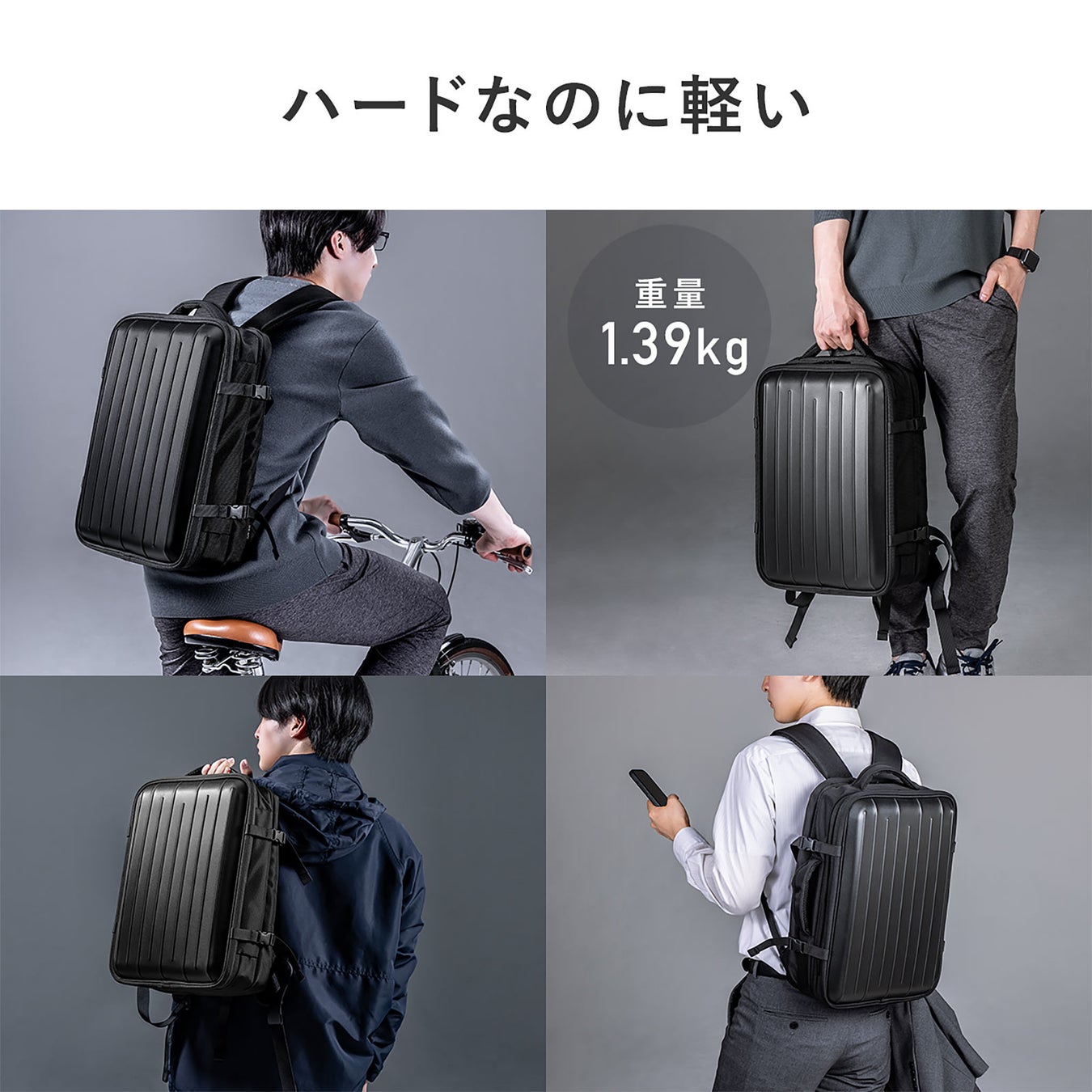 スーツケースのようなハードシェル素材を採用した衝撃に強いハードリュックで、収納物を衝撃から守ります。ハードなのに約1.39kgと軽く、軽量仕様と耐衝撃性能の両立を実現しています。