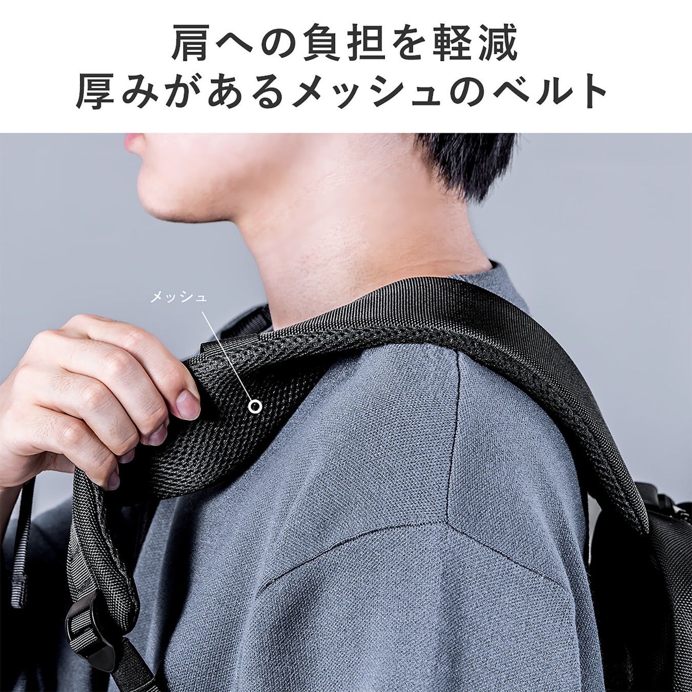 背中に当たる部分は立体構造のメッシュを採用し、風通しを確保。長時間の使用でも蒸れにくく、快適な背負い心地を実現しています。リュックベルトと背面クッションが、肩や背中の負担を軽減します。