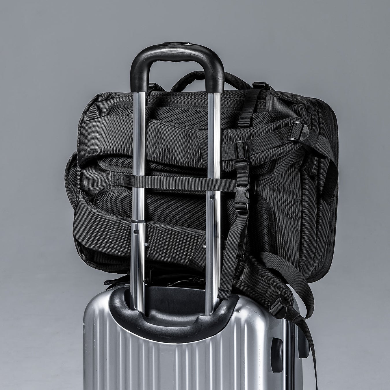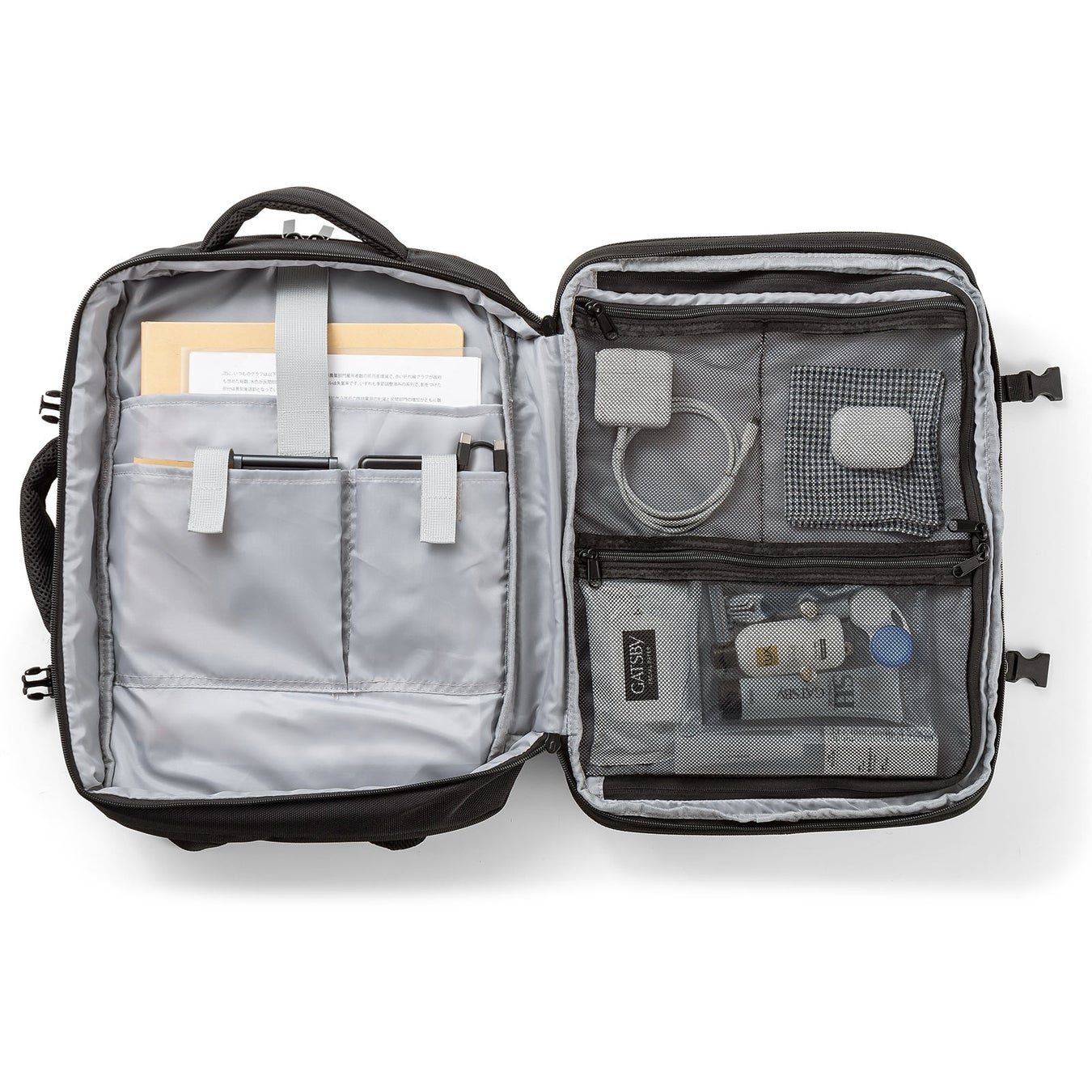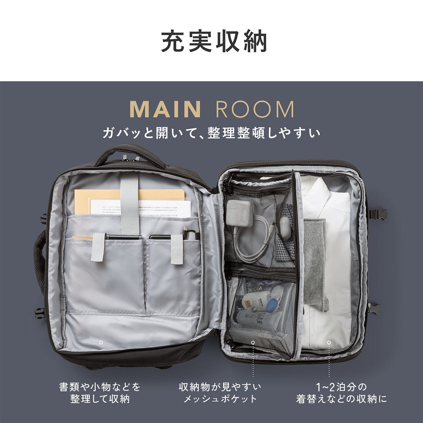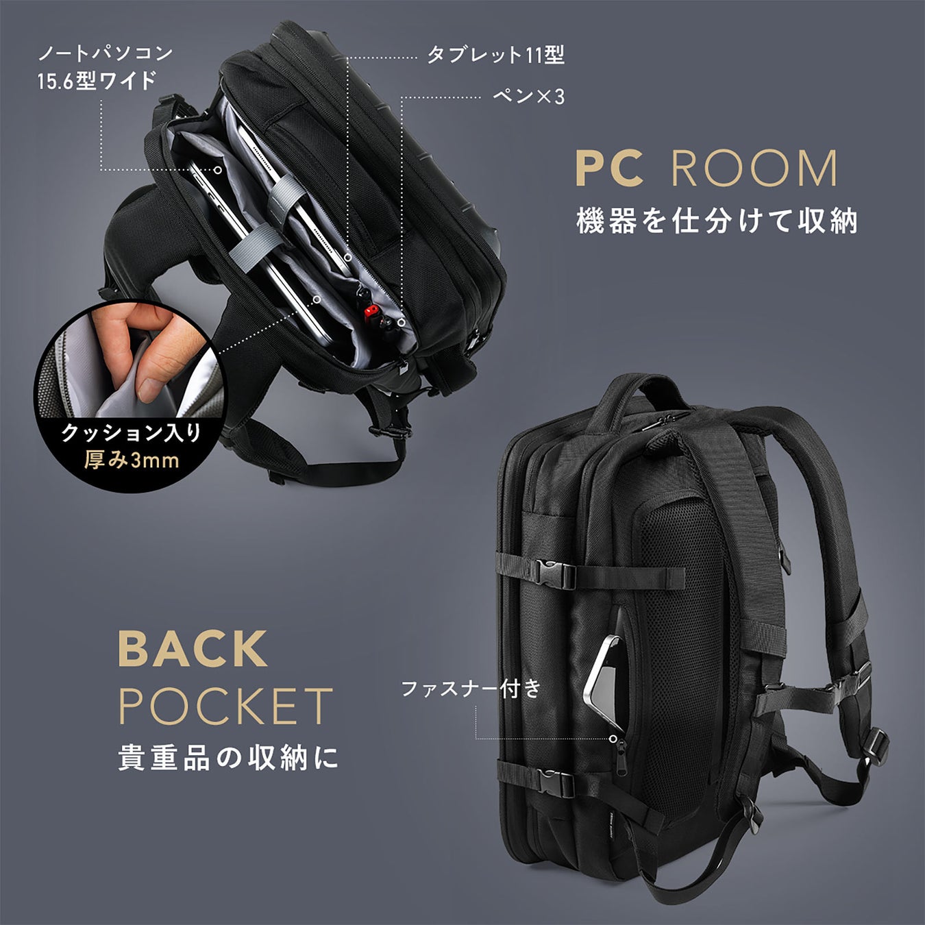 15.6型ノートPC、11型タブレット、ペンなどをしっかり収納できるPCルームが内蔵されています。メインルームはスーツケースのように大きく開くため、荷物の取り出しが簡単。貴重品を守る背面ポケットも便利です。