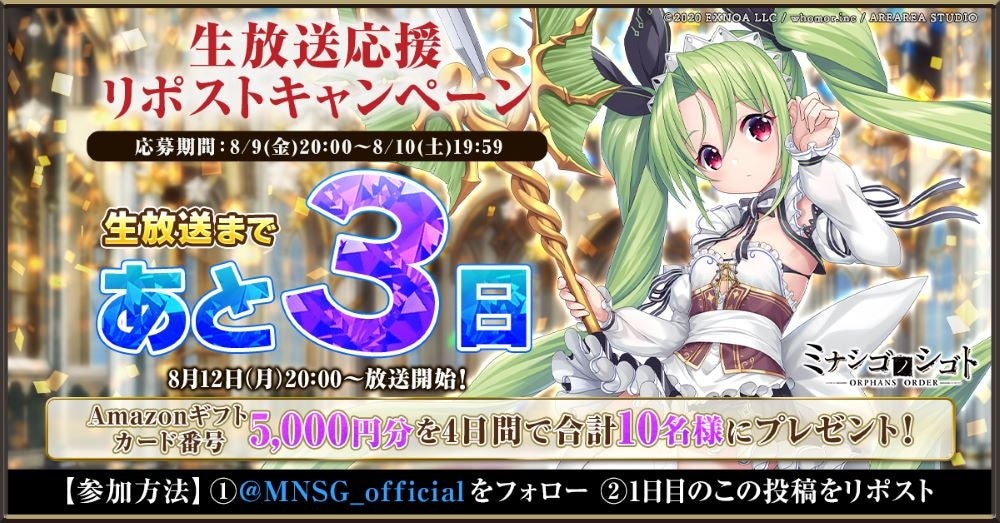 合同会社EXNOA(本社:東京都港区、CEO:村中 悠介、URL:https://games.dmm.com/)は、ターン制コマンドバトルRPG『ミナシゴノシゴト』(https://entry-site.minashigo-yusya.com/)において、8月12日(月)に公式生放送の配信を決定したことと、生放送に合わせたキャンペーンの開始をお知らせいたします。