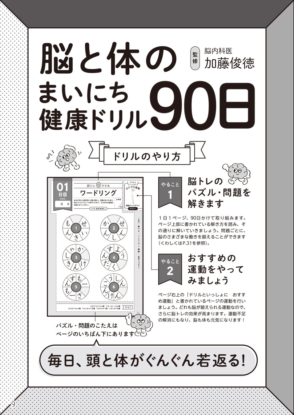 本書「脳と体のまいにち健康ドリル90日」で脳と体を鍛えるパズル&体操が、自然と毎日の習慣に。何歳になっても、いきいき元気な脳と体へ!