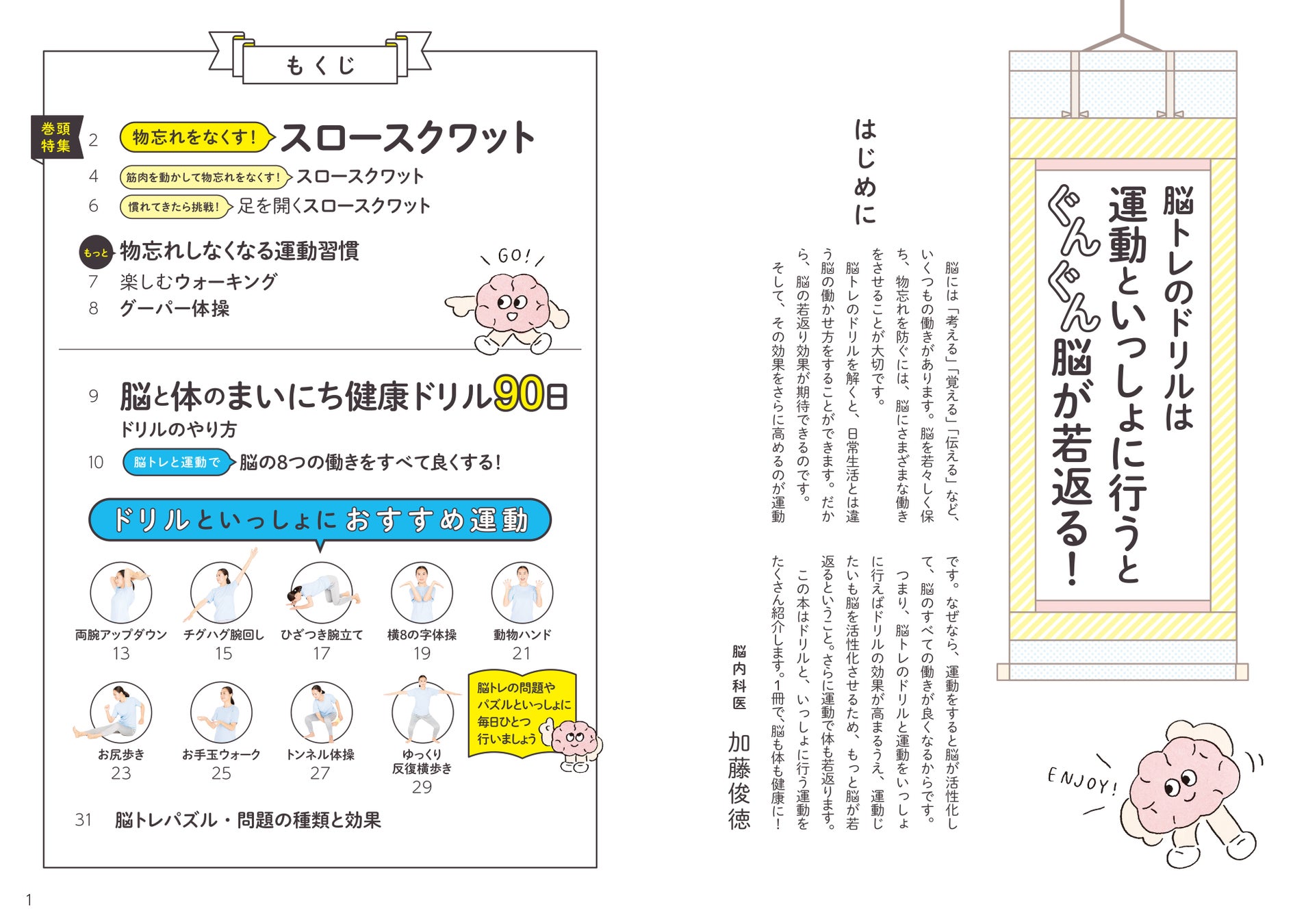 アナグラムや同じもの探し、ひらがな計算から懐かしの歌やテレビ番組のタイトル思い出しクイズまで、楽しい脳トレ問題やパズルがたっぷり。さらに、一緒に行うと効果的な体操を紹介。体操の監修も脳内科医の加藤俊徳先生。体操にも、脳と体の両方を鍛える効果が期待できます。
