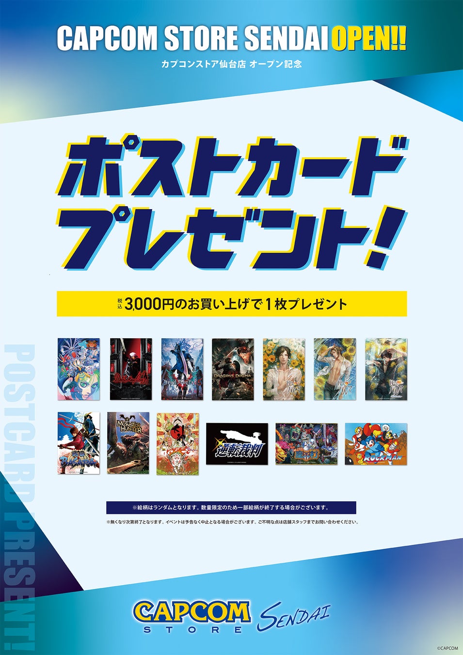 期間中、CAPCOM STORE SENDAI(カプコンストア センダイ)店内商品を税込3,000円以上ご購入いただくと、カプコンキャラクターの描かれたポストカードをランダムで1枚プレゼントいたします。