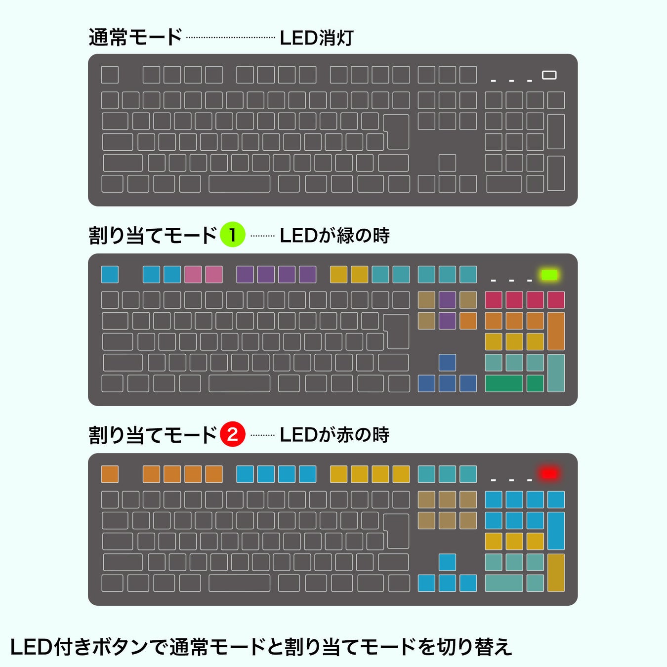 スタンダードな108キーボード+43キーに割り当てできるモード1・モード2をボタン一つで切り替えできます。