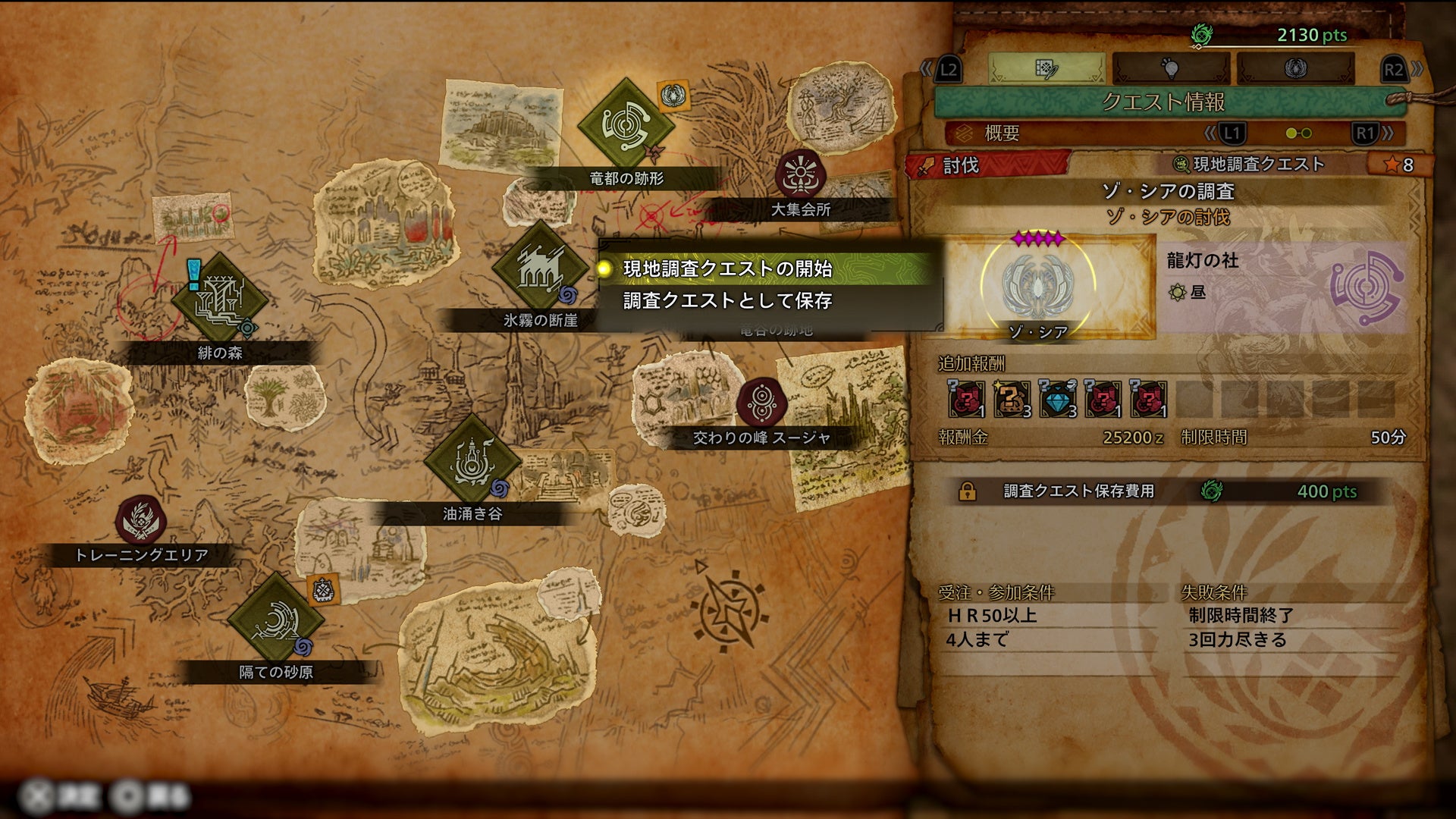 クエスト化して現地調査クエストとしてすぐ開始するか、調査クエストとして保存して後でチャレンジすることもできます。