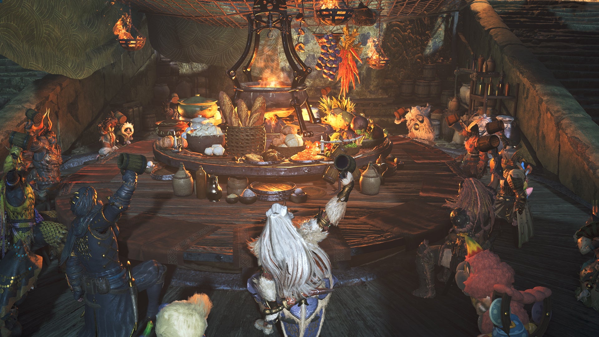 大集会所ではアイルーによる食事提供を受けることができ、他のハンターたちとテーブルを囲んでコミュニケーションを楽しめます。また、他のハンターと腕相撲で勝負をして交流を深めることなども可能です。