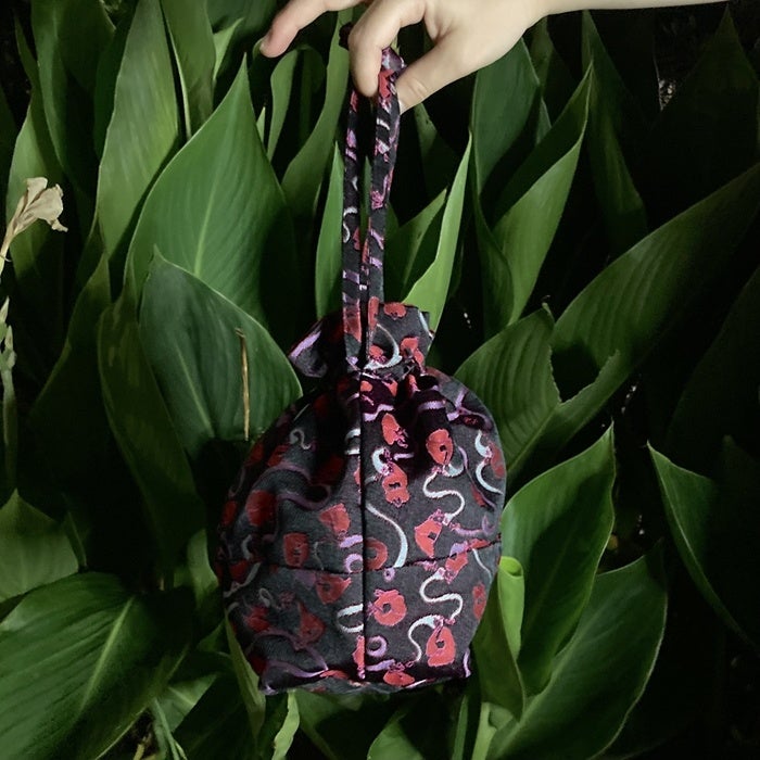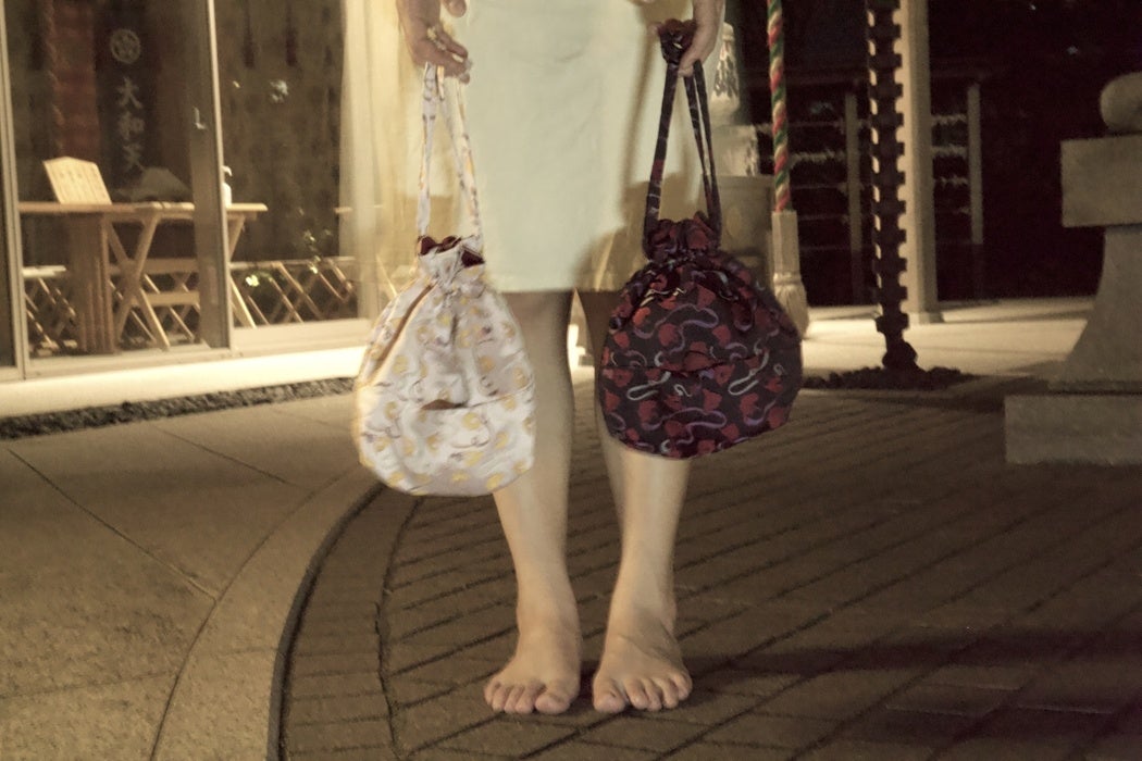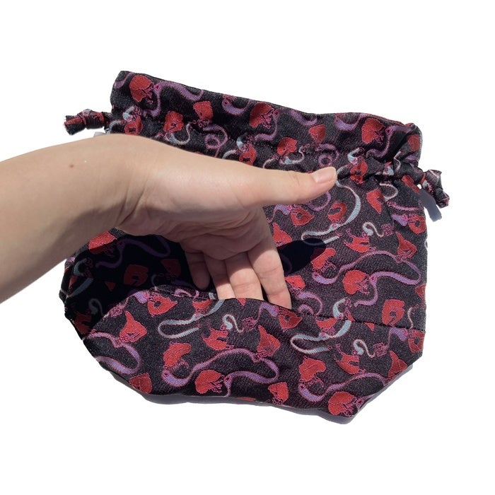 後頭部にもう一つの口を持つという、女性の妖怪二口女柄の巾着です。