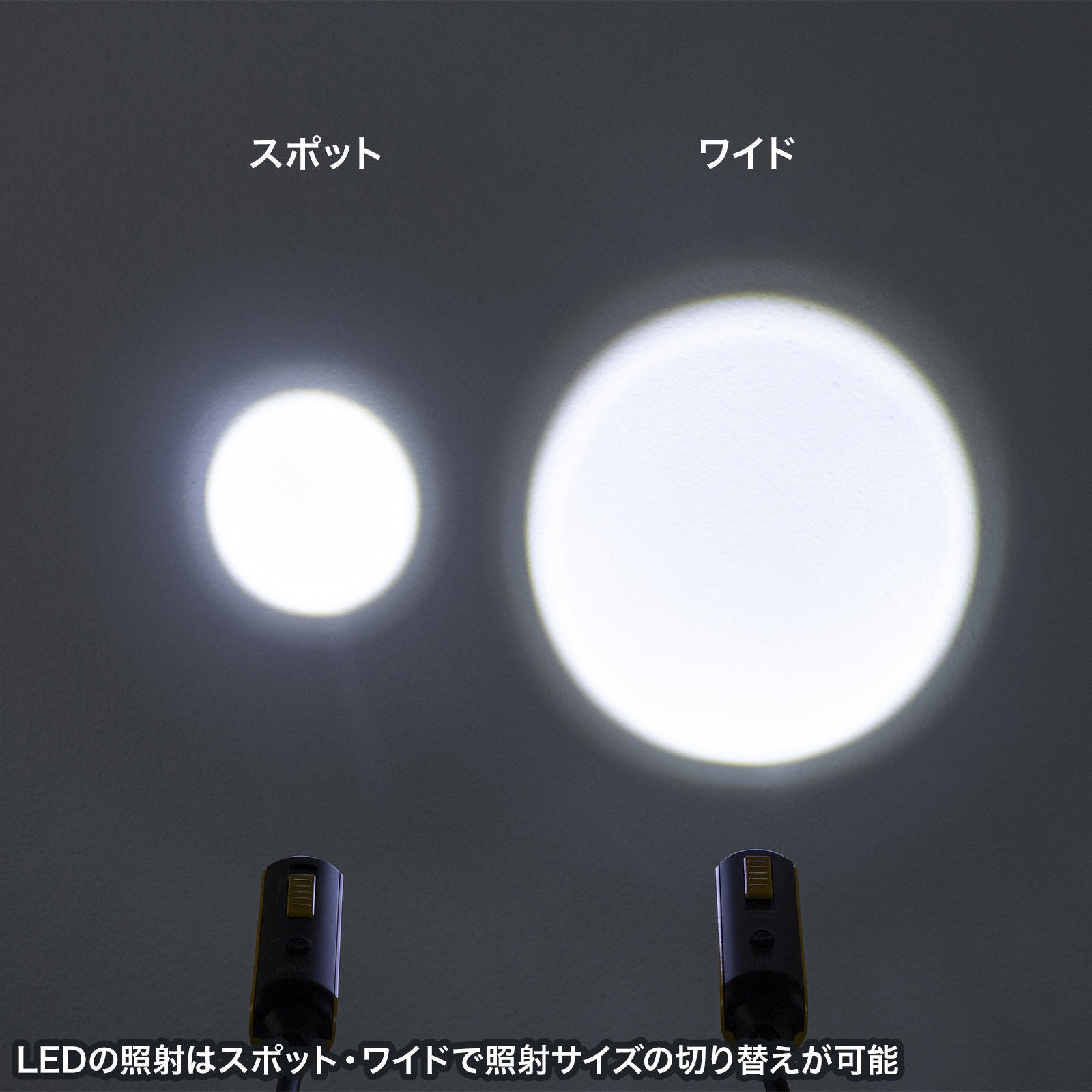 照射切り替えボタンで、照射範囲をスポット・ワイドの2種類に切り替えることができます。明るさは、ライト1つあたり最大約120ルーメンで、強・弱の2段階で光量を調節可能です。暗い屋外を広範囲に照らしたい、手元の資料を照らしたいなど、シーンに応じた照射を実現します。