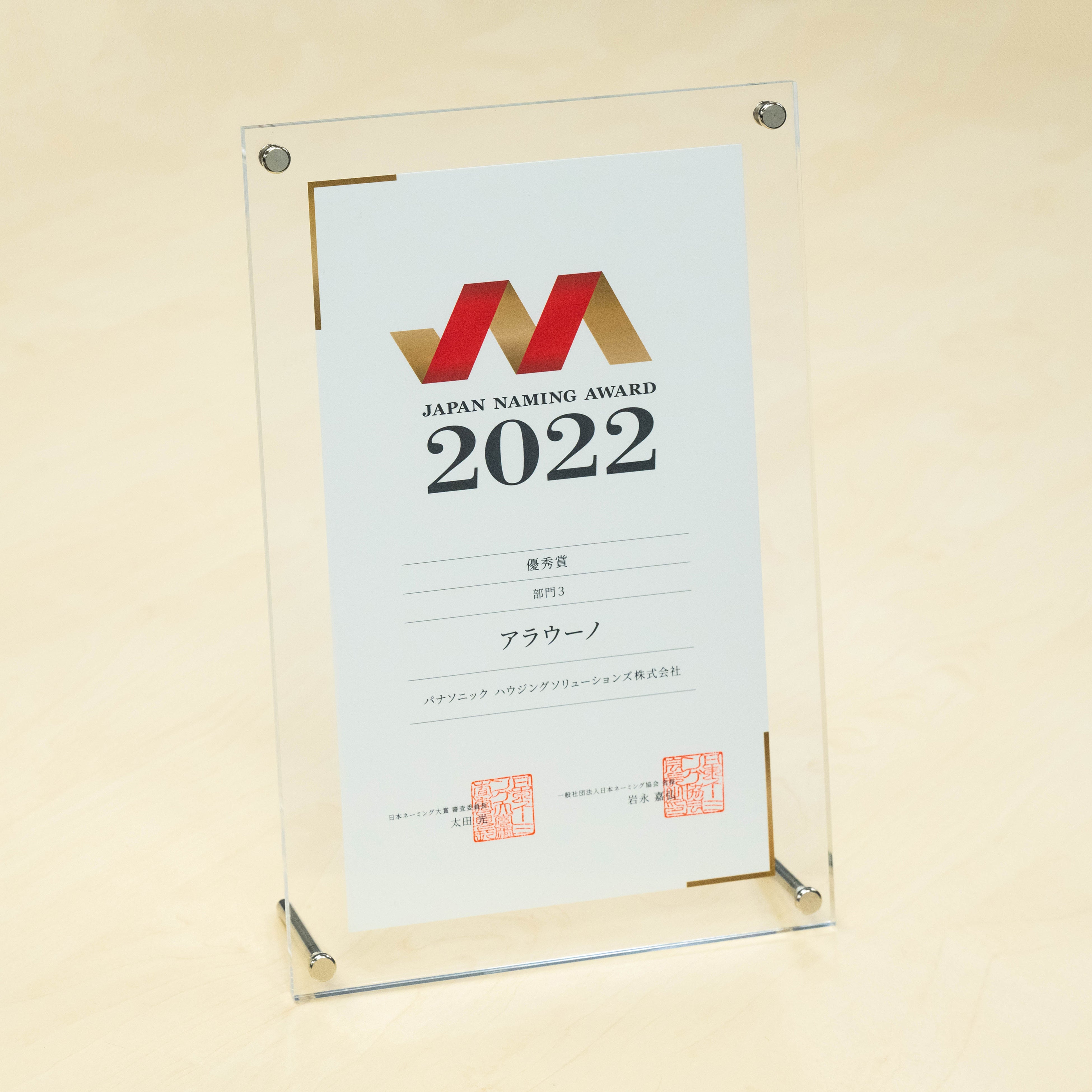 日本ネーミング協会は『ネーミングはマーケティングに貢献するだけでなく、生活文化を豊かにしていく力がある」と考えます。その意味でも「アラウーノ」は全自動おそうじトイレを分かりやすく伝えると同時に新しい生活文化を築いていく力があり、2022年に賞賛すべきネーミングである』と評しました。
