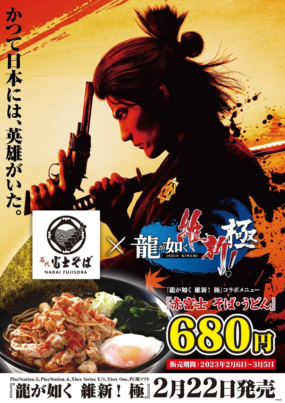 株式会社セガは、2023年2月22日(水)に発売予定のPlayStation®5、PlayStation®4、Xbox Series X|S、Xbox One、Windows、PC(Steam)用ソフト『龍が如く 維新! 極』において、東京都内を中心に展開する立ち食いそばチェーン「名代 富士そば」とのコラボレーションメニュー販売企画を2月6日(月)から実施中です。