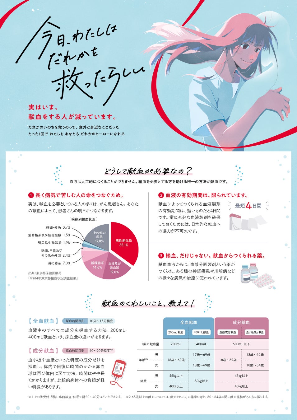 春の献血キャンペーンでは、企業と連携して献血の協力を呼びかけ、ポスター・動画等による周知を行います。みなさまのご理解・ご協力をお願いいたします。