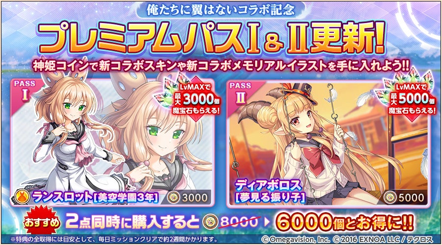 合同会社EXNOA(本社:東京都港区、CEO:村中 悠介、URL:https://games.dmm.com/)が運営するDMM GAMESにおいて『神姫PROJECT』は、『俺たちに翼はない』との期間限定コラボキャラ「渡来明日香」「玉泉日和子」が新しく登場することを発表した。さらにコラボイベントや最大320連の毎日無料10連ガチャを開催。9月2日よりプレミアムパスの特典が更新される。