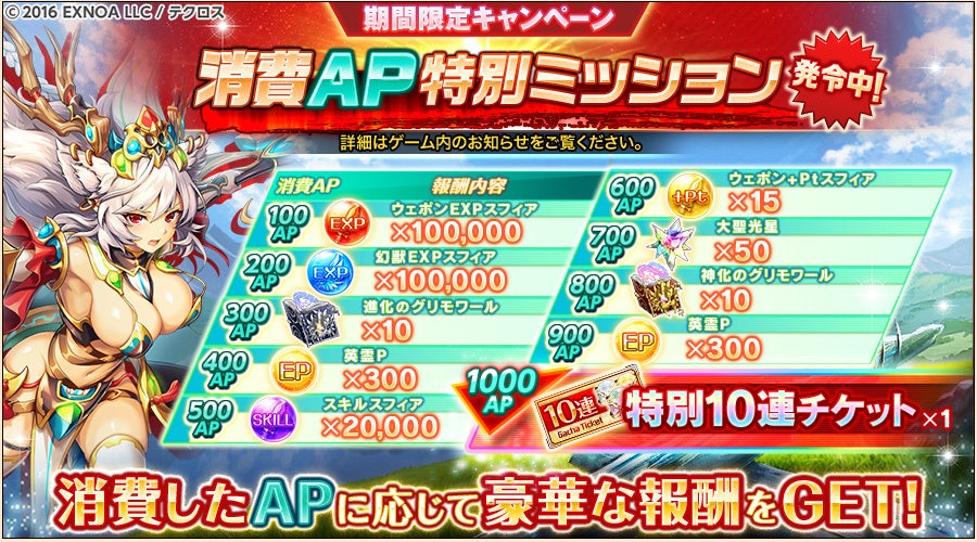 AP消費が条件となる特別なミッションをクリアすると、特別10連チケットや強化素材など豪華報酬が手に入るキャンペーンを開催します!