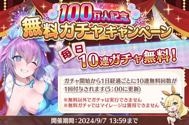 100万人突破を記念して、1日1回無料10連ガチャを実施します。