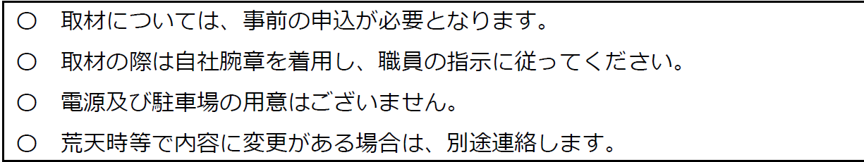 ①貴社名 ②代表者氏名 ③ご連絡先電話番号(当日連絡が取れるご連絡先)をご記載ください。 ④ご連絡先メールアドレス ⑤取材人数:ムービー〇名 スチール〇名 ペン〇名 ⑥備考(連絡事項等があれば連絡してください)