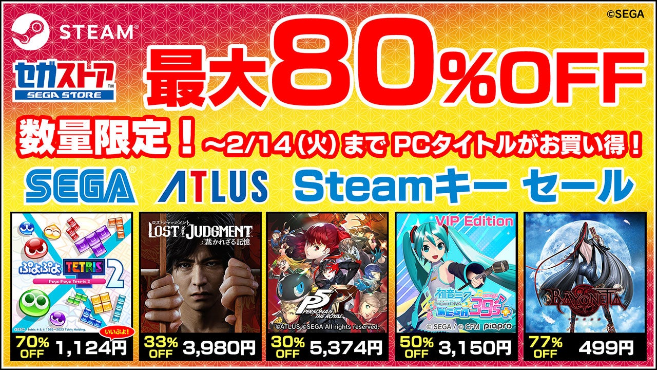 株式会社セガは、Steamにて販売中の一部PC用セガ・アトラスタイトルのSteamキー(ダウンロードコード)を対象とし、数量・期間限定で特別価格にて販売する“数量限定!SEGA/Atlus Steamキーセール”をセガストア(https://ebten.jp/sega/1768)にて開催中です。