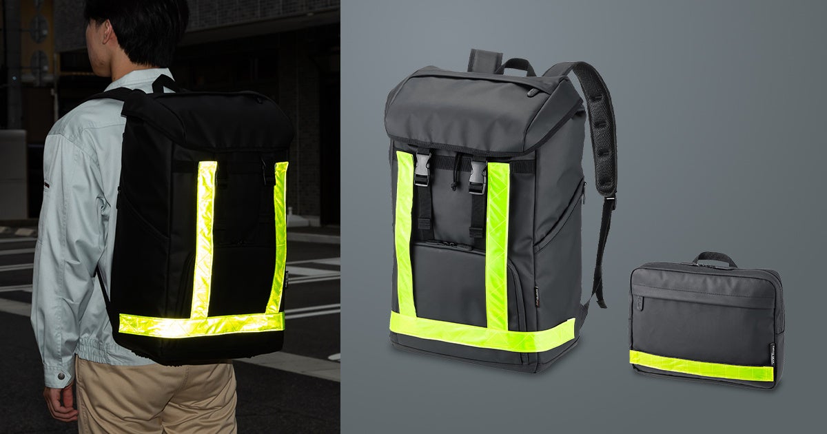 夜間現場での視認性抜群、反射テープ付きリュックとポーチを発売