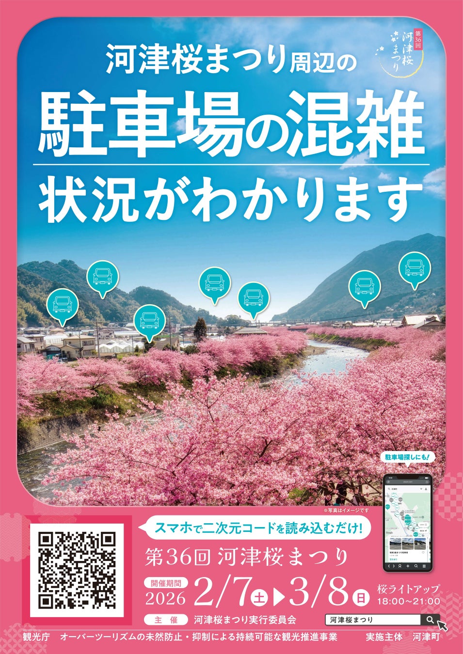 河津町では、毎年河津桜の開花に合わせて、国内外から50〜60万人ほどの観光客が訪れます。しかし、マイカーによる来場が集中し、駐車場へのアクセスや混雑状況が現地に行かないと分からないため、周辺を回遊する車両が増え、より混雑してしまうという課題がありました。